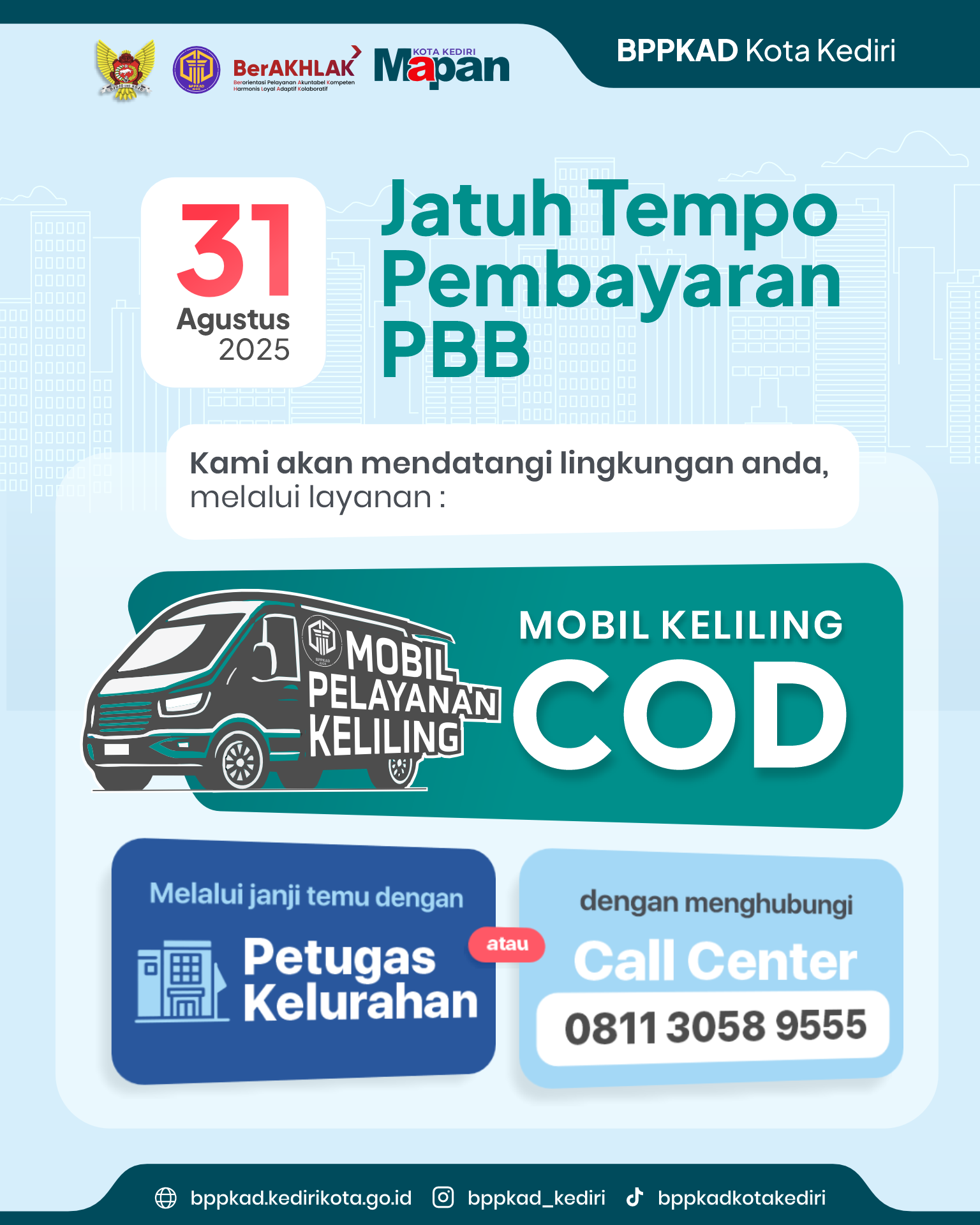 Kediri-Fenomenatv.com-Pemerintah Kota Kediri melalui BPPKAD mengumumkan jatuh tempo pembayaran Pajak Bumi dan Bangunan (PBB) yaitu pada tanggal 31 Agustus 2025. Guna mempermudah masyarakat dalam memenuhi kewajibannya, maka disediakan layanan Mobil Pelayanan Keliling COD yang akan mendatangi langsung lingkungan warga. Masyarakat dapat memanfaatkan layanan ini dengan membuat janji temu bersama petugas kelurahan atau menghubungi Call Center 0811 3058 9555.